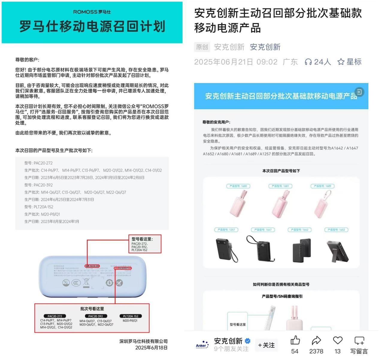 6月中旬左右,罗马仕、安克创新(300866)(300866.SZ)相继发布公告,召回存在安全隐患的移动电源产品。随后,民航局也发布紧急通知,加强对不合规充电宝的检查。